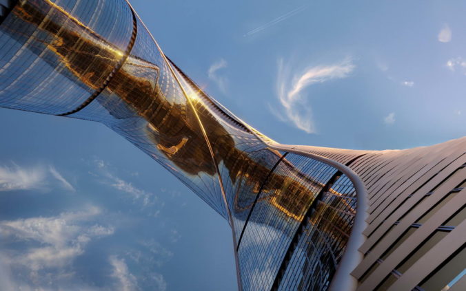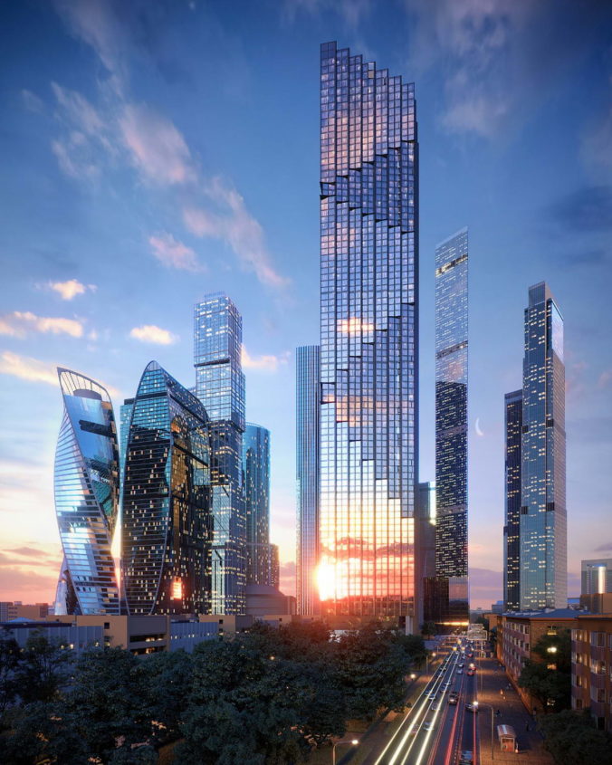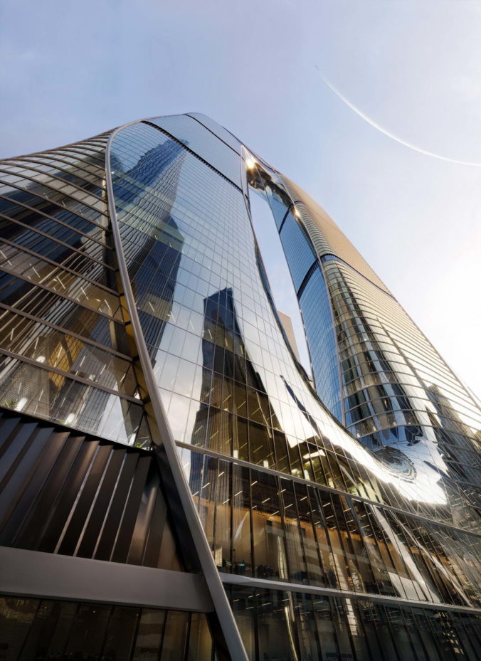 Премиальный 89-этажный небоскреб «Оне» (384 м) от MR включает две башни на общем стилобате, объединенные плавными переходами в ленту Мебиуса – символ непрерывного движения и прогресса. Фасад здания будет оформлен сплошным витражным остеклением из моллированного (гнутого) стекла. Необычный экстерьер комплекса выполняет не только эстетическую, но и практическую функцию. Благодаря уникальным архитектурным решениям все помещения в проекте обладают панорамными видовыми характеристиками.