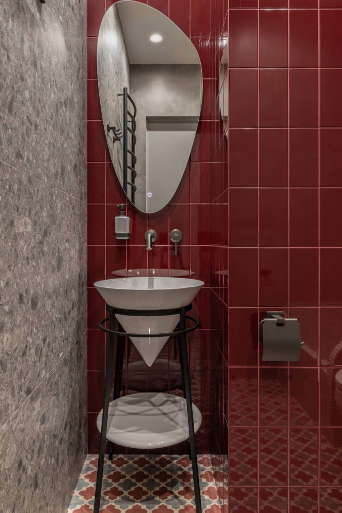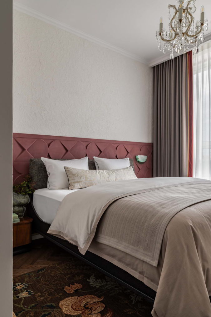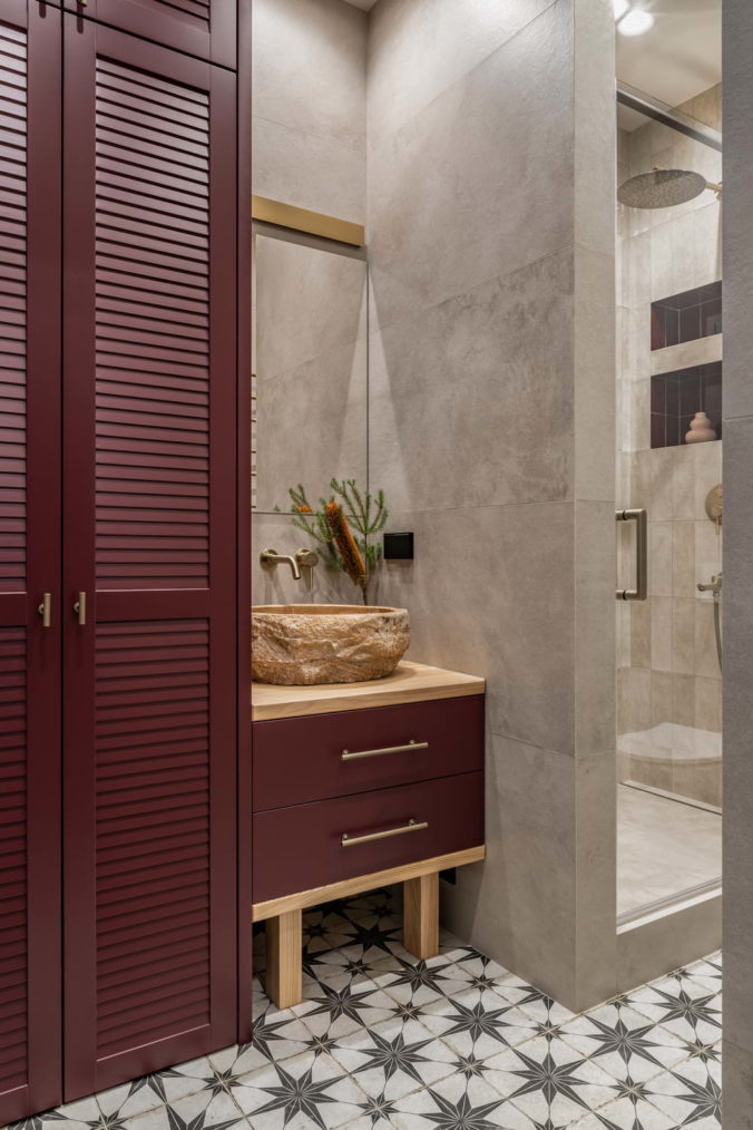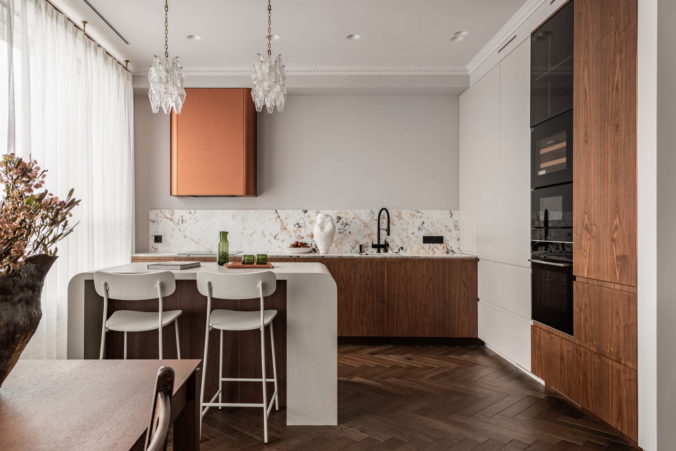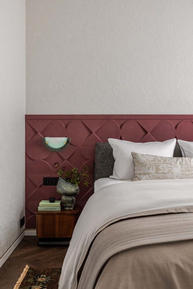 Что касается колористики квартиры, то она полностью снята с визуального ряда фильма “Цвет граната”, где в основе лежат глубокие сложные красные и красно-оранжевые оттенки: винный, гранатовый, красная охра, медный и цвет американского ореха, а также оттенки зеленого цвета: малахитовый, хаки, цвет хвои, мятный. Все эти оттенки прекрасно раскрываются на фоне светлой базы и натуральных природных оттенков дерева, которая где-то усиливает, а где-то наоборот проявляет выбранные цвета во всем своем благородстве.