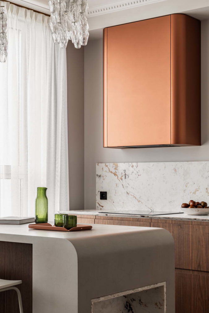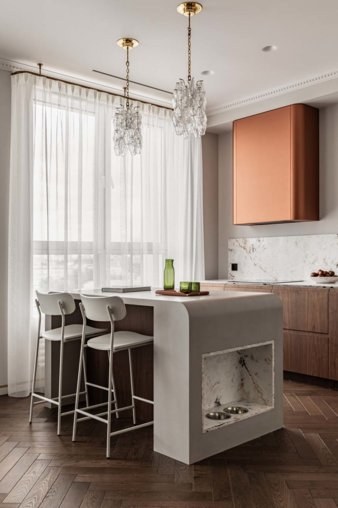 Одним из самых красивых элементов в интерьере стали широкие раздвижные двери с фацетом, которые помимо парадности наделены очень рациональной функцией объединения кабинета с зоной кухни-гостиной, где помимо острова у нас есть акцентная вытяжка, скрытая за шкафами с покрытием медной краской.