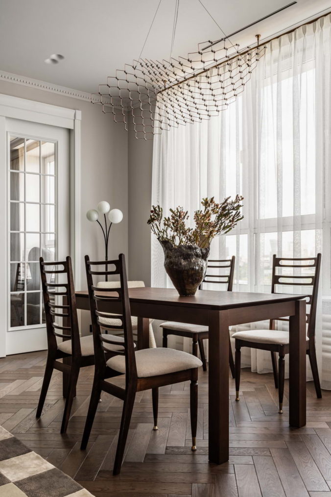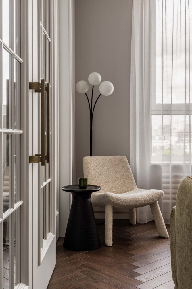 В проекте использовали очень много винтажа, найденного на просторах ресейла. Так, бра в спальню приехали из Италии. Потом заказчица привезла старую люстру дедушки, которую отреставрировали и разместили в спальне. Светильники на потолке в кабинете искали не меньше полугода – изначально был найден только один в Петербурге, а второй в Москве оказался продан. Но спустя время и постоянный мониторинг ему нашли пару в прекрасном состоянии. На кухне «поселились» винтажные стулья и светильники над островом, а в спальне прикроватные тумбы.