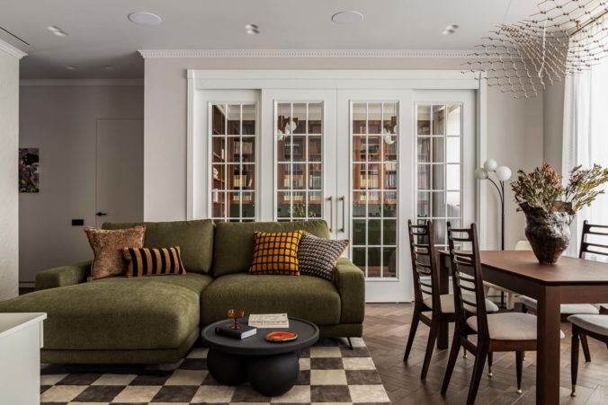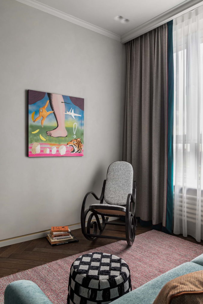 Заказчики – семейная пара коллекционеров книг и искусства, которая увлекается путешествиями и театром. Заказчица руководит pr-отделом в газете об искусстве, а заказчик трудится в корпоративном секторе. Для таких разных по роду деятельности людей было важно совместить функциональность и комфорт с полетом фантазии, творчеством и современностью, не загоняя себя в рамки условности и трендов, при этом тонко подметив и внедрив объективно полезные приемы и объекты в обиход и интерьер квартиры, в которой они планируют жить достаточно долго.