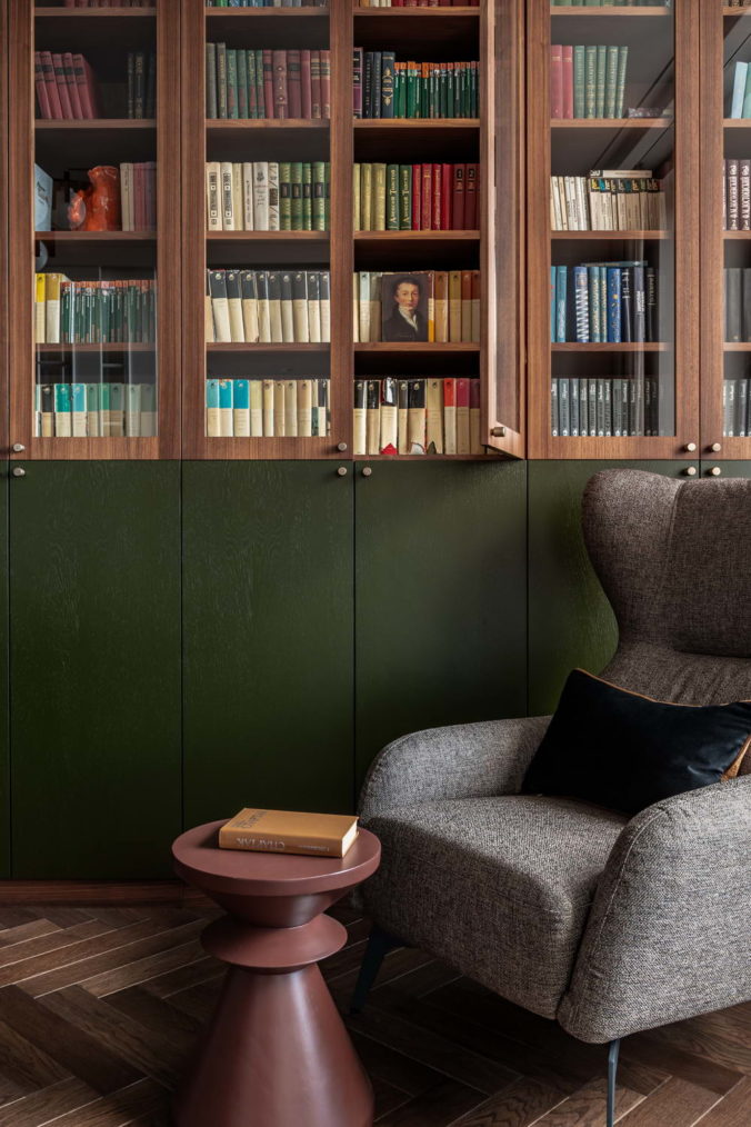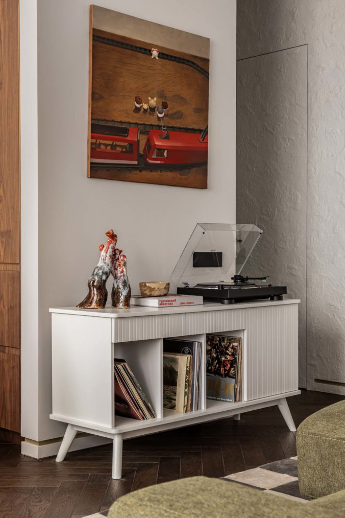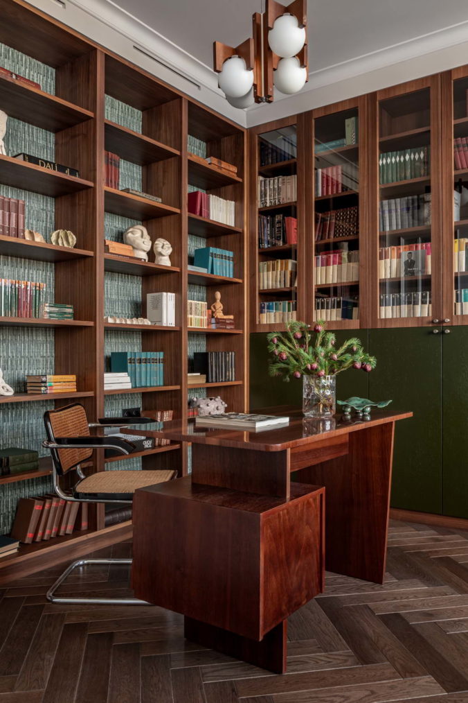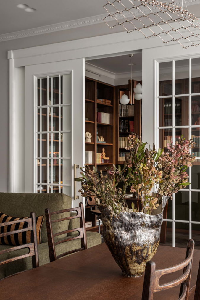 У заказчиков был четкий запрос на внедрение предметов искусства, коллекцию книг и винтаж как принадлежащий семье, так и приобретенный под проект. Особый пиетет отдан к семейным реликвиям, собраниям редких книг и предметам, несущим отпечаток времени. Каждый такой артефакт, кропотливо отобранный, бережно отреставрированный или привезенный из дальних уголков мира, становится не просто декором, а хранителем личных нарративов, маркером памяти для поколений.