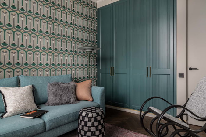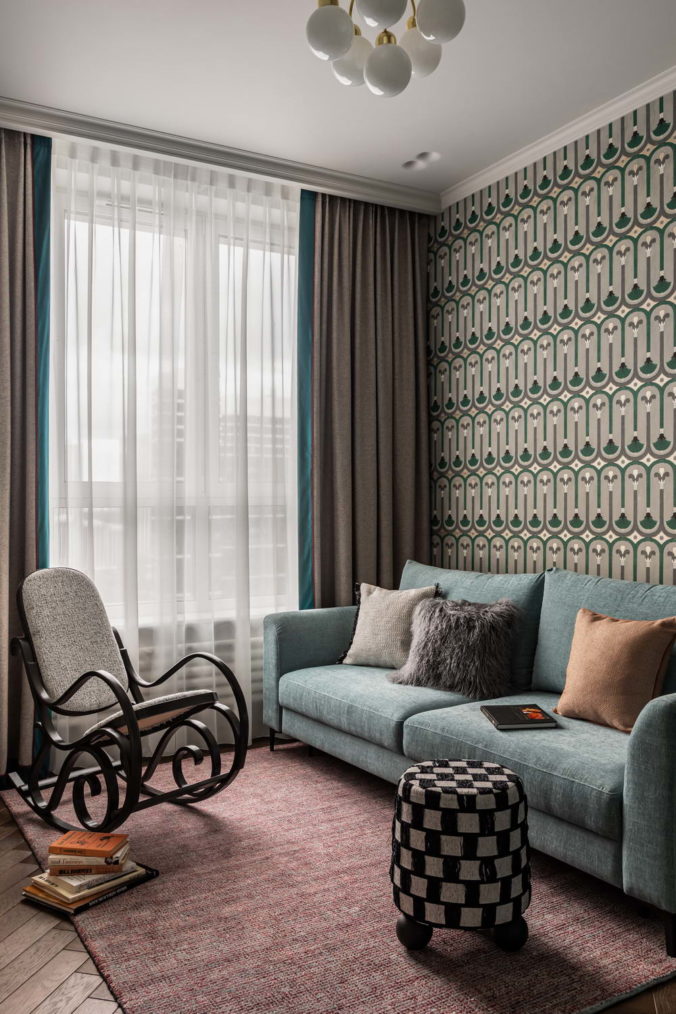 Гостевая комната, она же будущая детская, помимо тоже ярко выраженной этнической составляющей позволяет не ставить себя в рамки, поэтому здесь современный диван расположился рядом со старым дедушкиным креслом из Средней Азии, а финский винтажный торшер ведет диалог с китайскими обоями и пуфом, обитым красивой французской тканью.