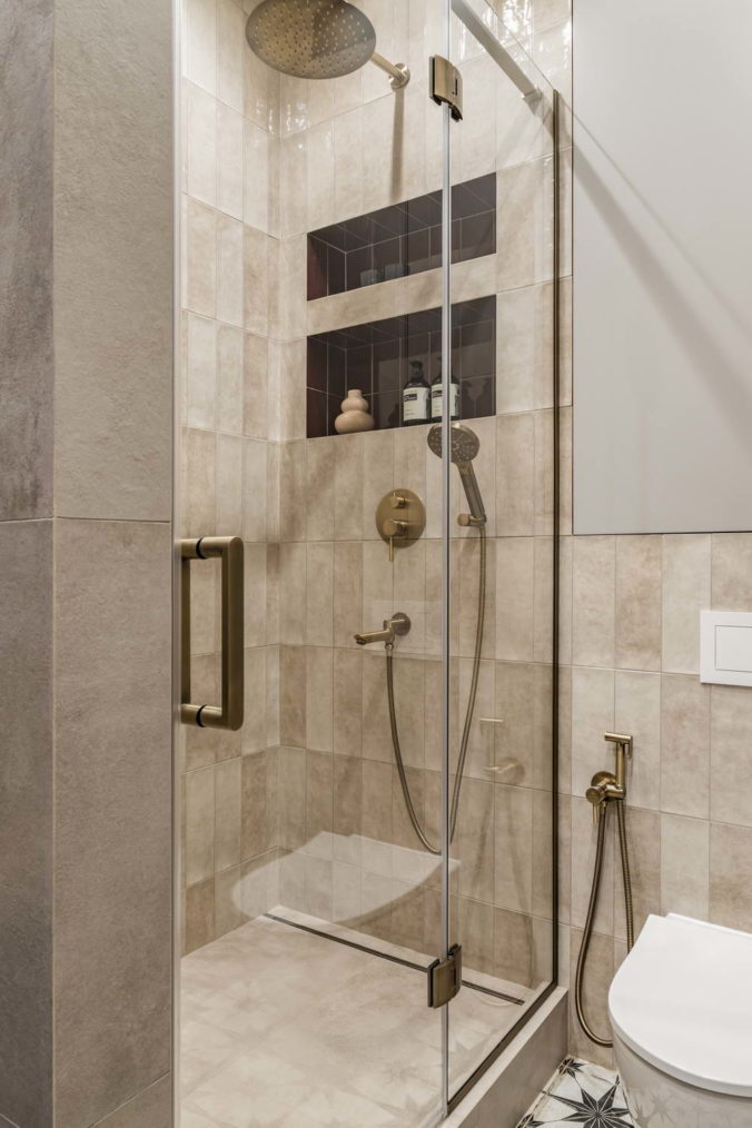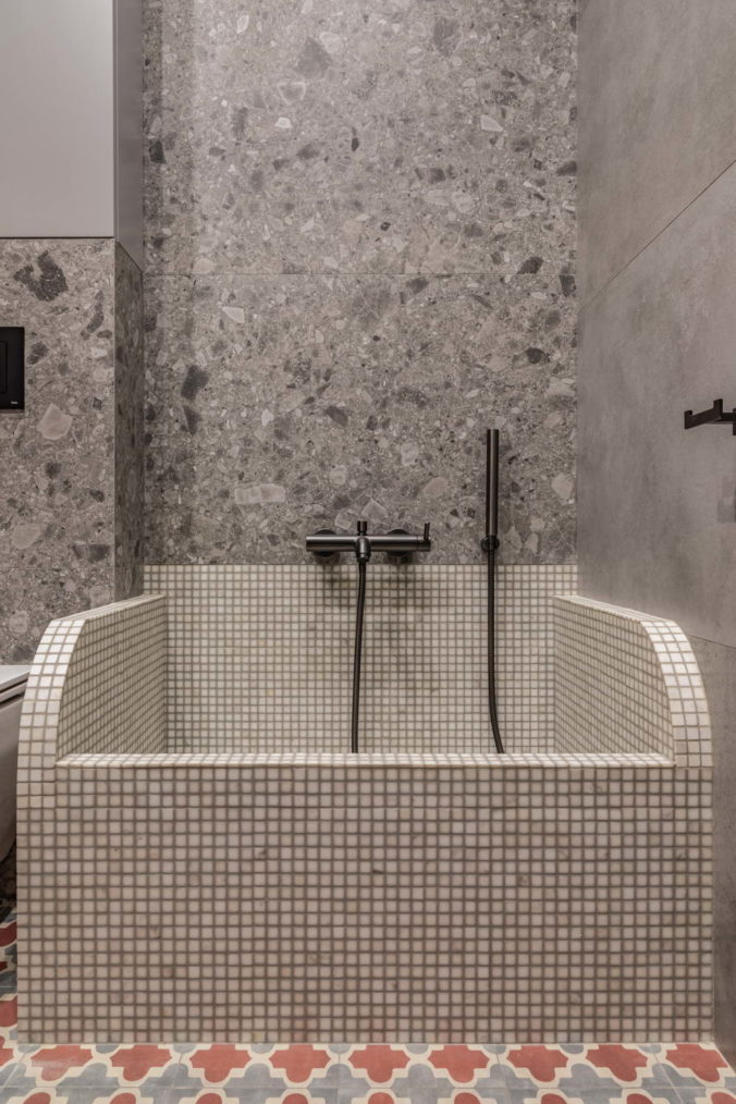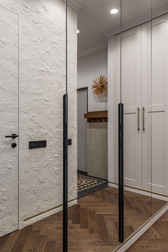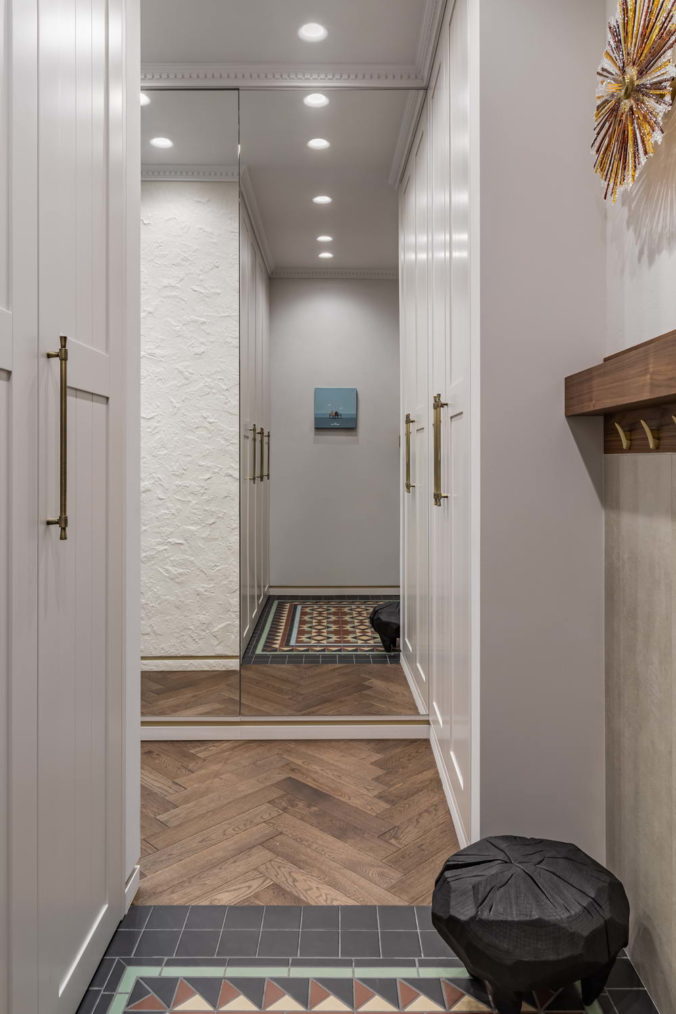 Одно из интересных решений этого проекта– ковер из керамической плитки на входе в квартиру. С одной стороны, это просто очень красивый элемент, периодически встречающийся в общественных пространствах, но мало кто знает и задумывается о том, как его реализовать гармонично на площади в 1 квадратный метр. Были сразу заказаны отдельные элементы, чтобы получить четкий ровный прямоугольник без подрезок, и это важно, поскольку плитка шла под заказ из Португалии 4 месяца.