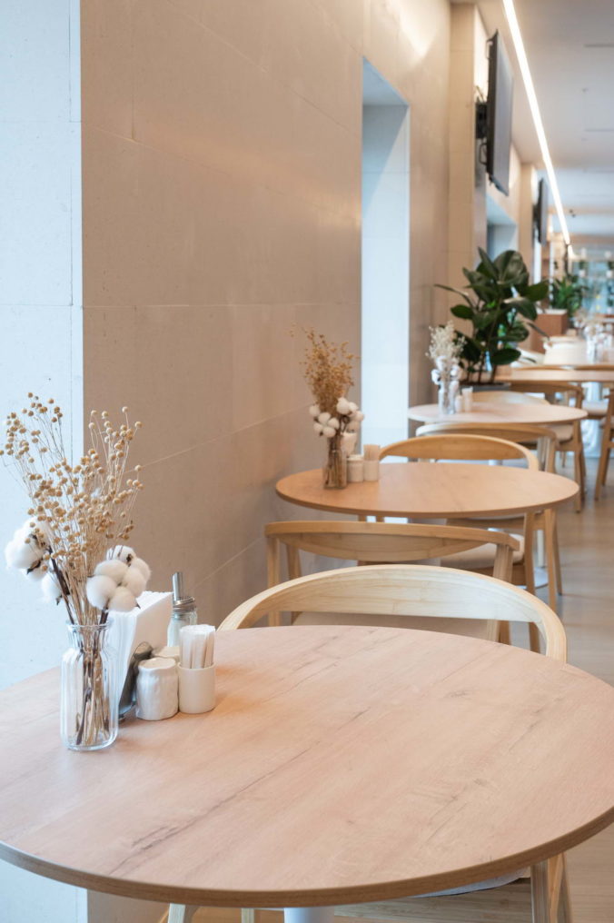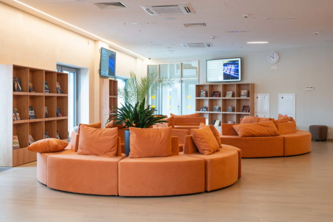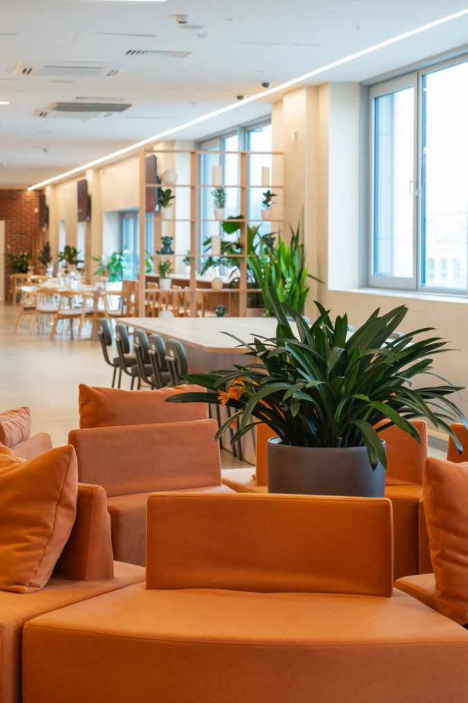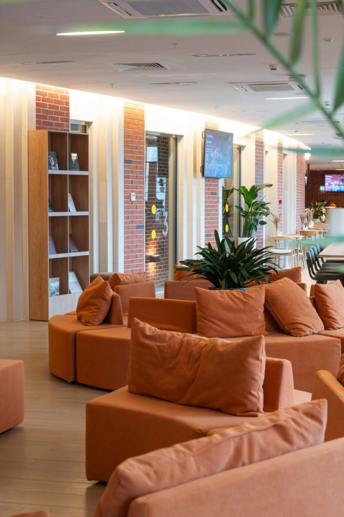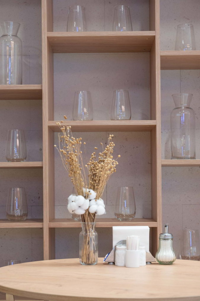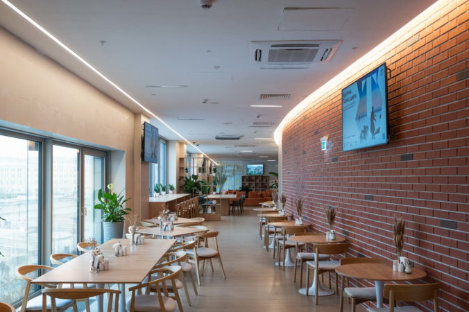 Единое пространство поделено на две части, в одной из которых расположено кафе, а в другой — книжная гостиная.