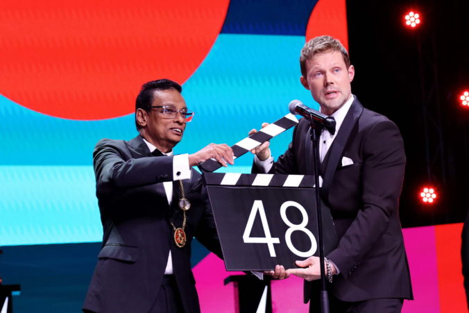 По традиции председателю жюри был вручен символ фестиваля – цепь власти, чести и достоинства с образом Георгия Победоносца. Вместе с ведущим Даниилом Воробьевым Прасанна Витанаге символической кинохлопушкой объявил 48-й Московский Международный кинофестиваль открытым.