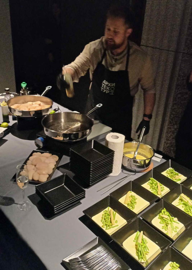 Запуск Дома «АрхитектурНО» прошел в формате шести ноябрьских вечеров «открытых дверей». Гости погружались в атмосферу визуального перформанса, создававшего иллюзию нахождения в природном ландшафте – в горах, лесу, у водопада. Световые инсталляции, мебель из натуральных материалов – в том числе предметы-иконы дизайна, живой джаз, гастрономические шоу от шеф-поваров и баристы — всё это превращало встречи в опыт, который хочется обсуждать и вспоминать.