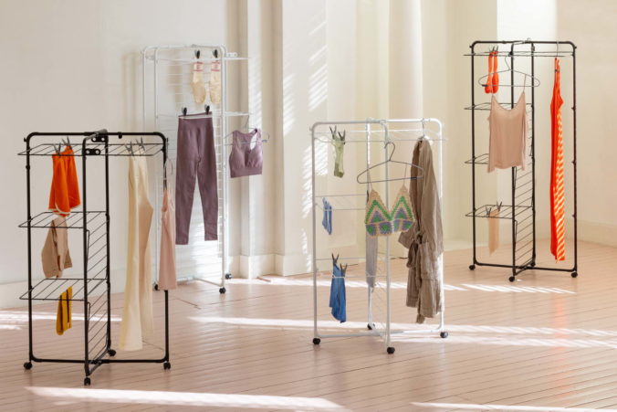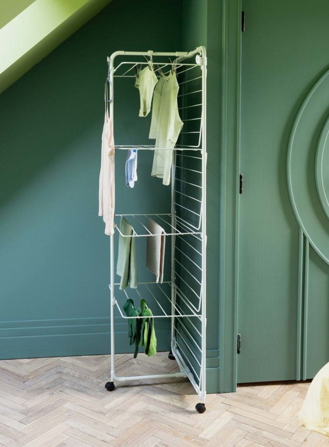Ключевое решение – вертикальная сушка. Вместо того чтобы занимать пол, система выстраивается вверх, освобождая комнату и возвращая ощущение порядка. Многоуровневые сушилки позволяют разместить больше вещей на минимальной площади, сохраняя легкость и чистоту пространства. Именно такова напольная сушилка ХэндОн Тоуэр/HangOn Tower. При компактном основании она предлагает до 30 метров рабочей длины для сушки, легко справляясь с двумя-тремя загрузками стиральной машины – от повседневной одежды до постельного белья.